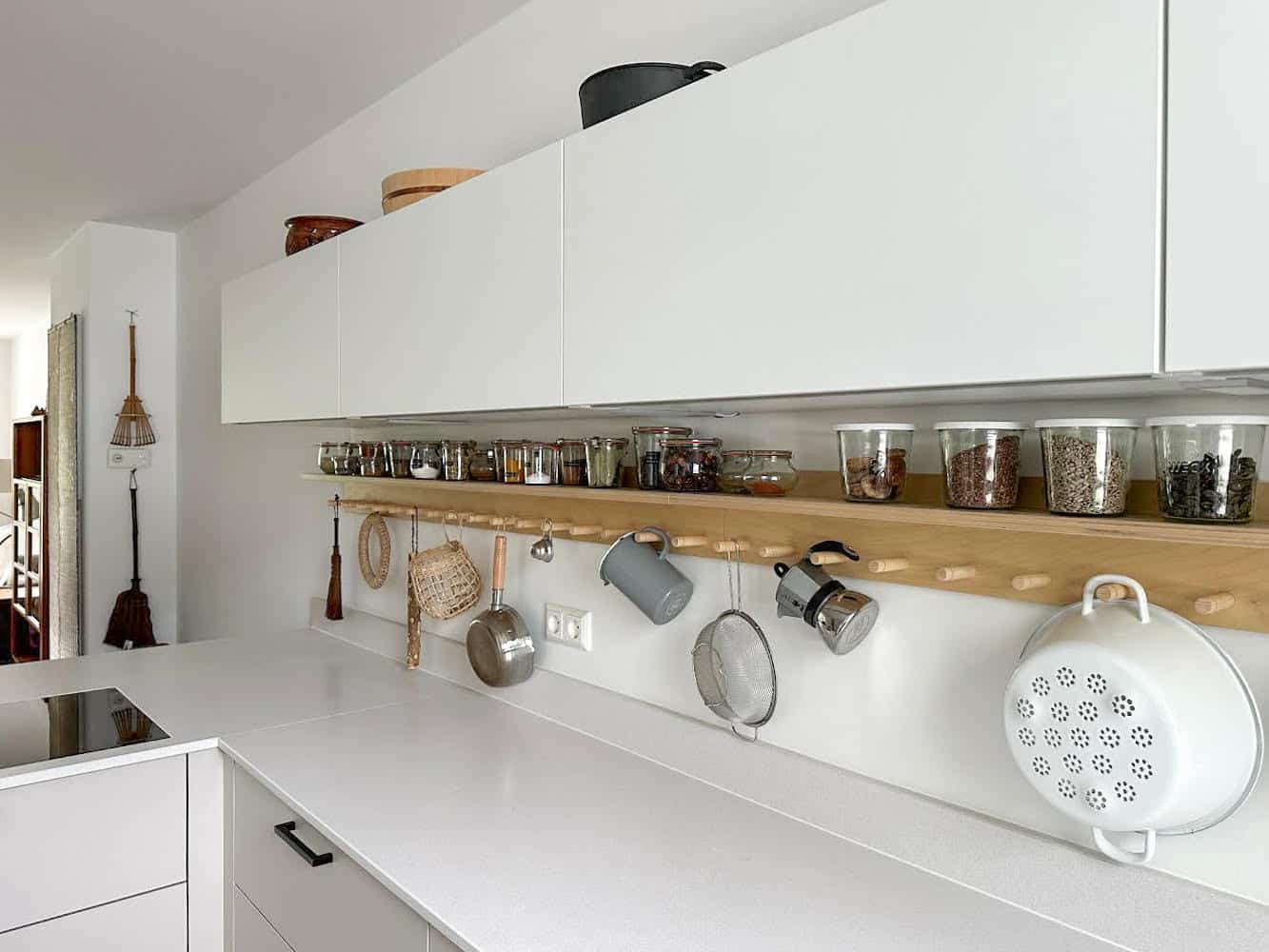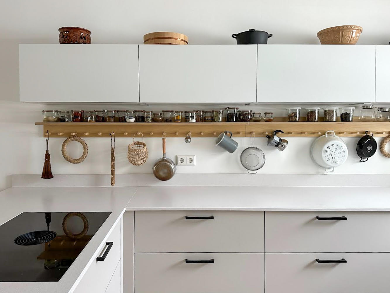 Two custom NAULAKKO 160s made to meet the clients brief of a continuous shelf under the walls cabinets. The shelf back panel was also made the same length as the shelf, unlike the standard NAULAKKO 60 and 80, where it is slightly smaller.